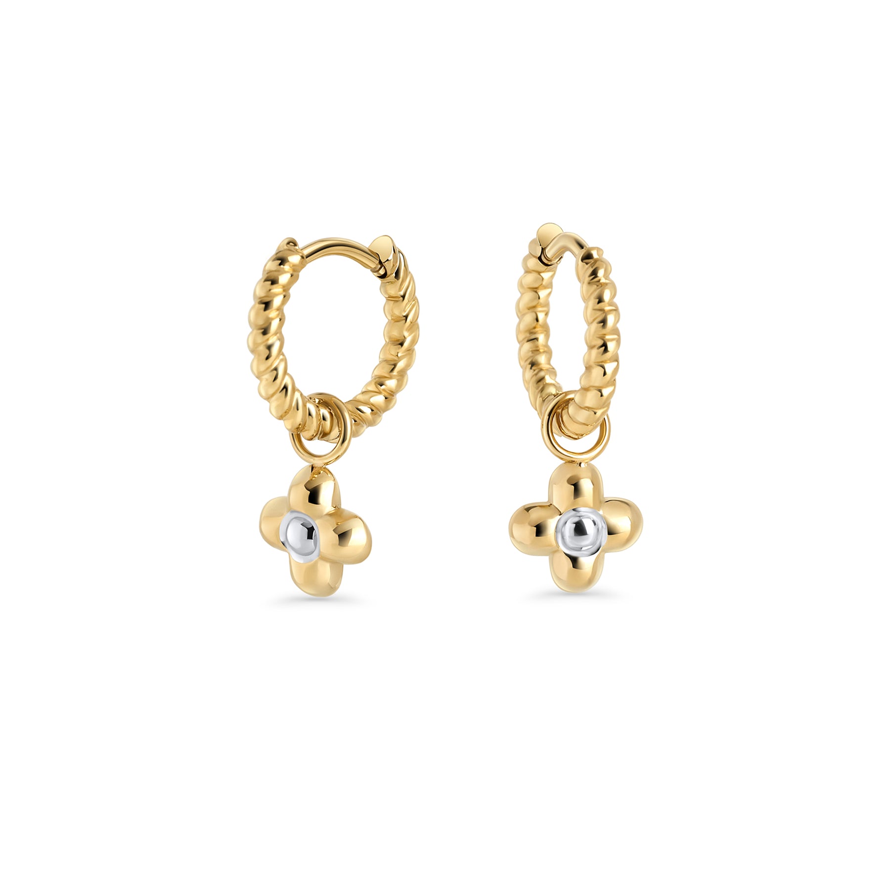 The Eclor Earrings feature an elegant twisted hoop with a delicate two-tone flower, symbolizing beauty, harmony, and femininity. Every detail is a subtle reminder of your inner strength and the light you bring into the world. A piece to wear as a talisman to shine and express yourself with grace.